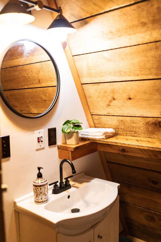 Tail End (cabin #5) is an A-Frame style cabin. A cozy living room and kitchen concept with one bathroom and bedroom downstairs and one lofted bedroom.